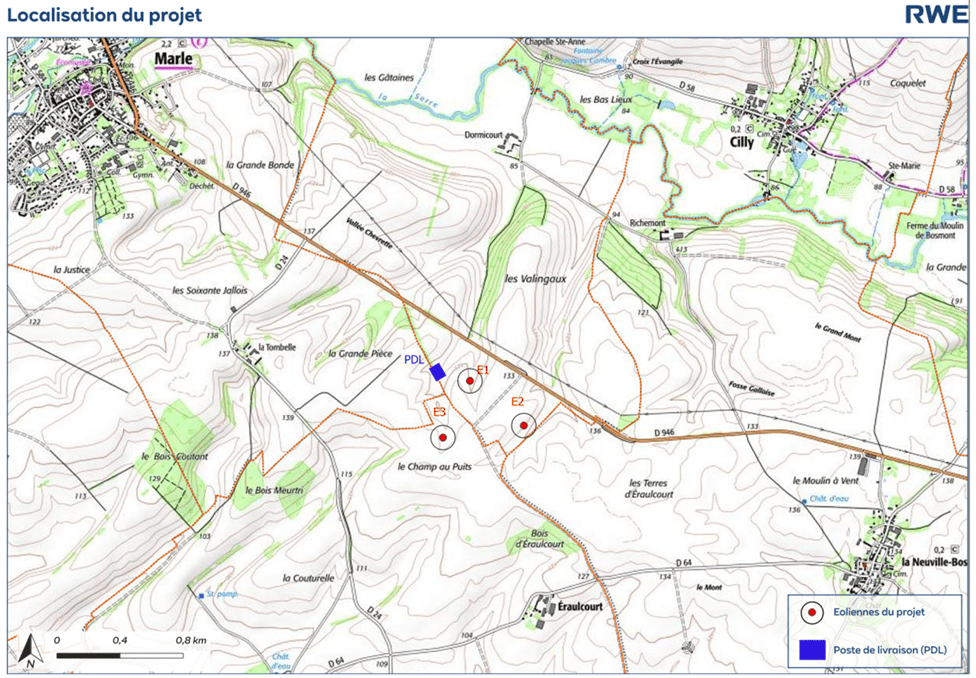La zone d’étude est située au sud de Montigny-sous-Marle et au nord d’Autremencourt (en bleu sur la carte). Les éoliennes suivront une trame d’implantation bien précise, définie selon le résultat des études en cours et qui prendra en compte les enjeux techniques suivants :